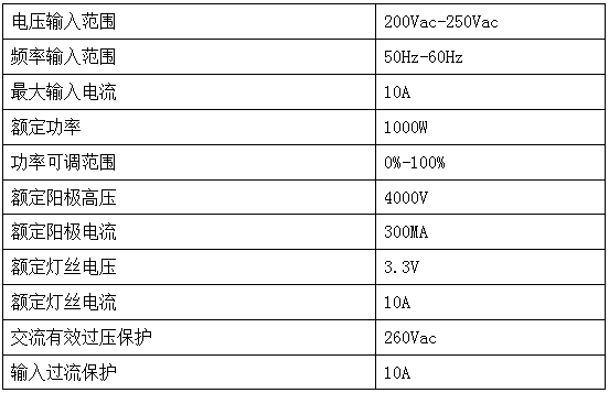 3. 主要参数 (1) 电源输入 输入电压 185-265V/50-60Hz 交流电; 输入电流 0-6.3A; 输入功率:0-1.38kW。 (2) 电源输出 阴极高压:4200Vdc; 阳极电流(Io):0-310mA; 输出功率:0-1300W。灯丝电压(Vf):3.3V; 灯丝电流(If):6-10A。 (3)效率: 3 90% (4) 功率控制方式:电压/电流 (5) 冷却方式:强制风冷 (6)工作温度:-30-+55℃ (7)接地方式:外壳地+导线连接; (8)尺寸/重量:250(L)×170 (W)×105 (H)mm/1kg (9)安装形式:机箱下边配有安装底板,底板与固定平面以四颗 M4 螺钉连接,底板螺丝过孔位于正方形的四个角,正方形边长 100mm。 (10) 灯丝线:硅胶高压线,耐压等级 50kV,标配长度 1m。